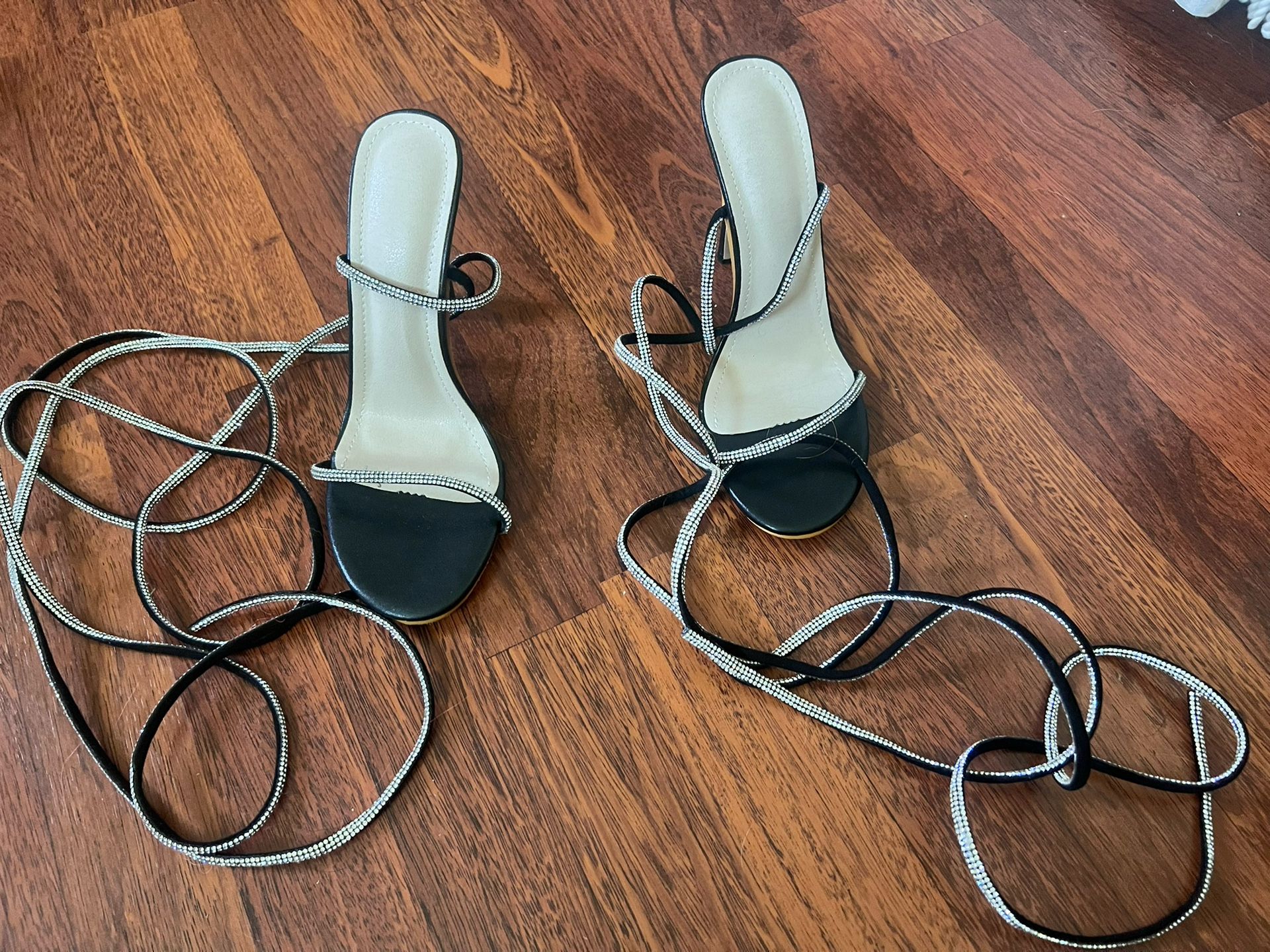 Leather black heel with rhinestone straps. Size 40