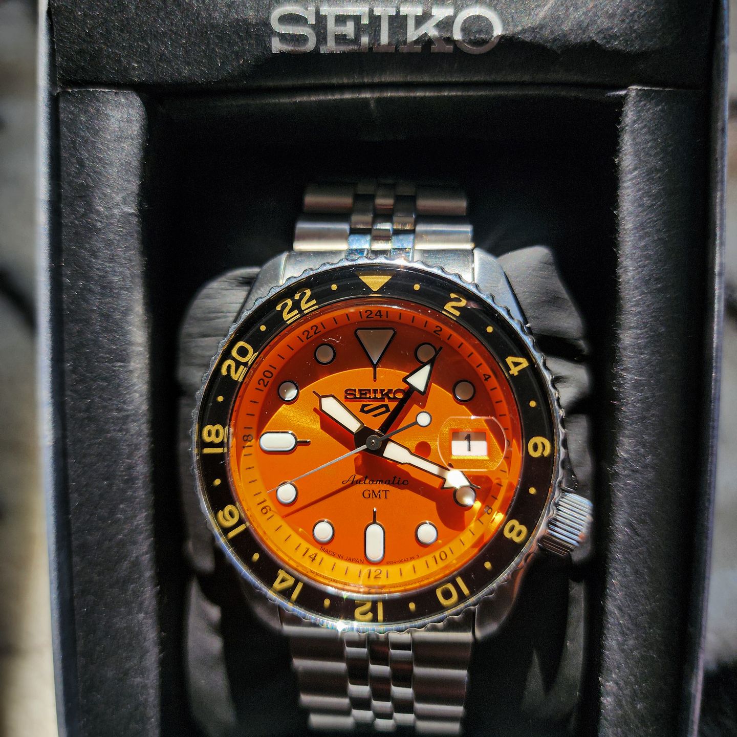 Offered for sale is a Seiko 5 Sports GMT SSK005 featuring the striking orange dial and black/gold 24-hour bezel. This is the full bracelet version and comes complete with box, outer box, warranty card, manuals, hang tag, and all original links. The watch is in excellent condition, showing only very light signs of careful wear. Crystal is clean and free of scratches. Bezel alignment is sharp, GMT hand functions correctly, and the movement runs as expected. Bracelet includes all original links and presents very well. Specifications: • 42.5mm stainless steel case • Automatic 4R34 movement with GMT function • 24-hour bi-color bezel • Hardlex crystal • Jubilee-style bracelet • 100m water resistance • 41-hour power reserve This model has become one of the most popular entry-level mechanical GMTs thanks to its bold dial, reliable movement, and strong everyday wearability. Well cared for and ready for its next owner. Local meet preferred. Shipping available. We can negotiate a better price, text me! 😃