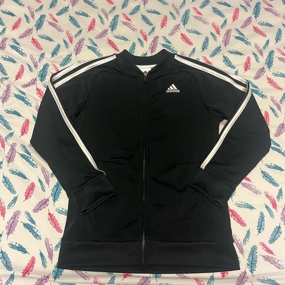 Stylish black track lacket with white stripes Features Adidas logo on the chest. Size 7 In good condition