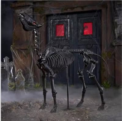 New in box Pick up in Wayne Wv The Home Accents Holiday 5.5 ft. Grave & Bones LED Skeleton Pony has red LED-illuminated eyes and makes an authentic creepy horse neighing sound effect. It has sound sensor activation and is the perfect Halloween decoration for both indoor and outdoor use. Skelton Pony uses 3 AA batteries (included). Be sure to add Skeleton Pony to your Grave & Bones Halloween collection. Pairs great with the 5 ft. Grave & Bones Animated LED Hearse. Indoor/Outdoor Head and neck are poseable Sound sensor activated Spooky sound effects 10 minute assembly time Battery operated Requires (3) AA Batteries; Included Shop the full exclusive Home Accents Holiday Grave & Bones collection here Pairs great with the 5 ft. Grave & Bones Animated LED Hearse