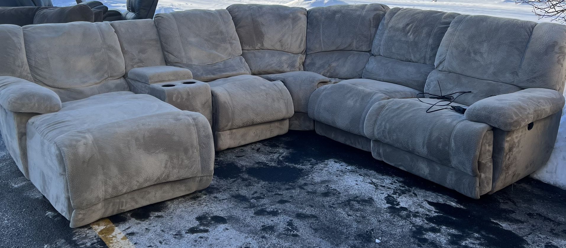 Sectional End seat chaise is manual reclining Other end seat is electric reclining Comes apart into 6 pieces Has cup holder Can deliver as well Negotiable