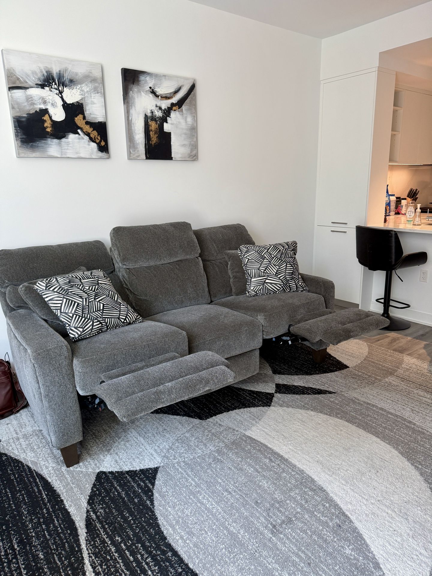 Love this sofa, only selling due to move. Casual, contemporary FORM meets FUNCTION. This Power Play reclining sofa showcases style with creative design and attention focused on details. A huge pad sits atop each arm of this plus sofa, making it an easy location to watch tv or take an afternoon nap. The bustle back cradles you in comfort while your lower body is supported with pad-over-chaise seating. The Power Play’s beauty is not just skin deep! DIMENSIONS: Overall Width 96.00" Overall Depth 39.00" Overall Height 42.00" Seat Width 44.00" Seat Depth 22.00" Seat Height 21.00" Add the pictured black coffee table, rug, and frames for $20!