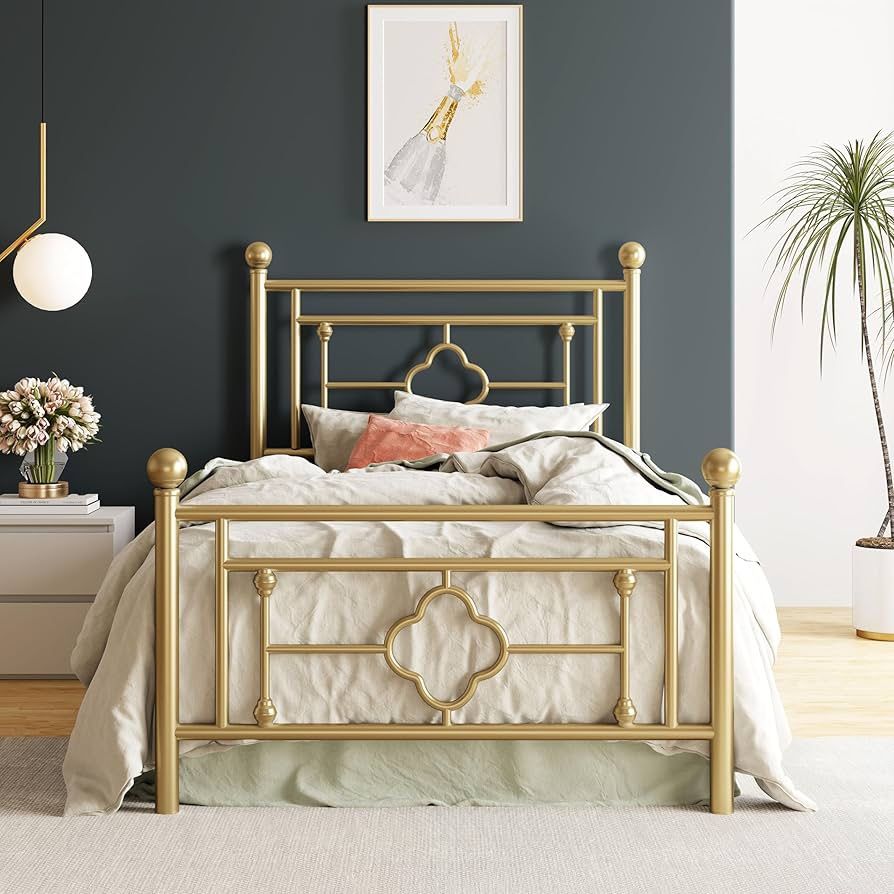 Modern and Elegant: The headboard and footboard featuring finial bed posts and ball finial accents make a statement in any bedroom space Strong and Durable: This platform bed is fully constructed of a metal frame and multiple support legs for a large load-bearing capacity Ample Storage Space: This mattress foundation stands 12.4" off the floor for easy storage. You could put some storage boxes under the bed to tidy your clothes, toys or quilts Noise-Free: Our twin bed feet come with plastic foot plugs that prevent scratches and noise on your floor. Providing you with a quiet sleeping environment 8538-13