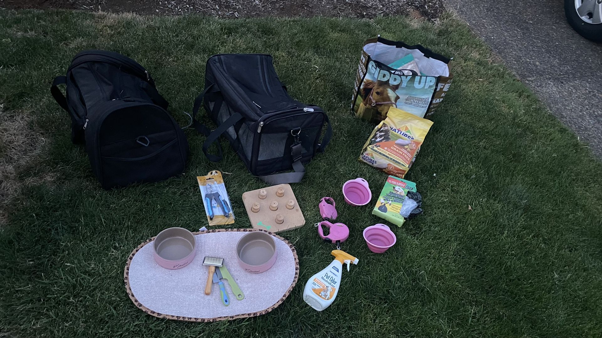 Finally saying goodbye to my 2 fur babies. 2 ceramic food balls 2 travel carriers Dog food & treats 2 collapsible dog leashes 2 travel water bowls And more …