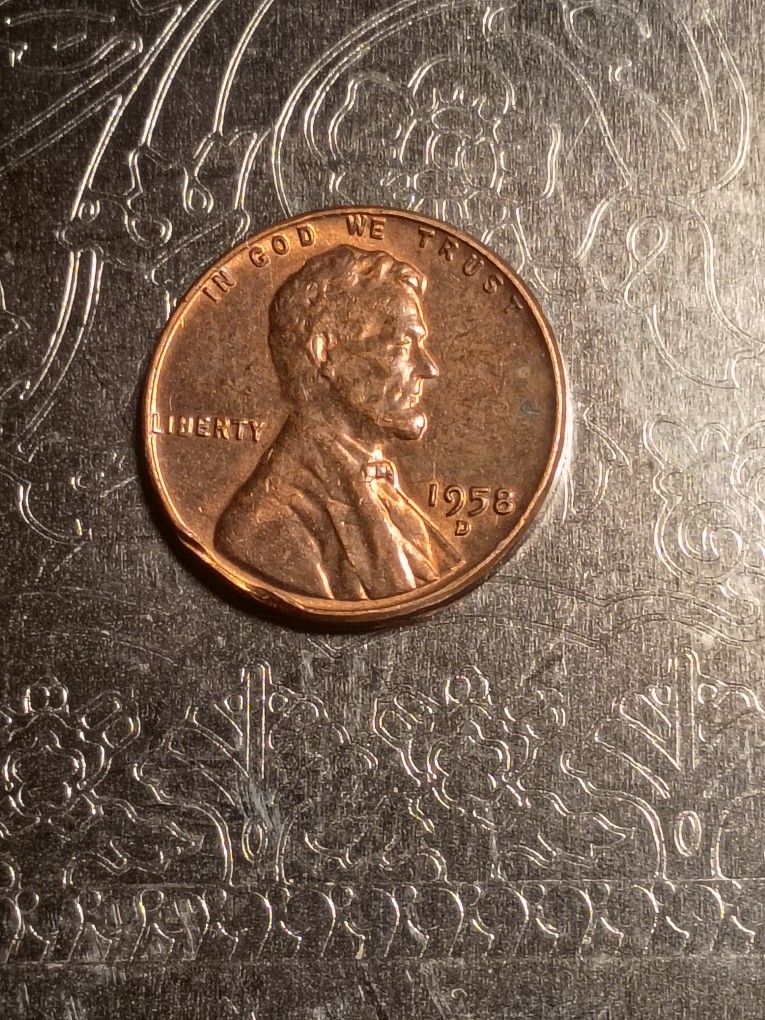 Red 1958 d wheat Penny arrow coin l in the rim doubling in Liberty