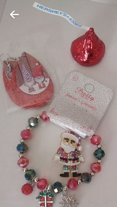 Adorable Christmas jewelry bundle great for a family member, friend, or coworker. Gift includes Santa and Hersey chocolate kiss pin. Gnome earrings and a stretch crystal bracelet with holiday charms. All items are new except Hershey pin. Available for pick up in Mira Mesa cash only please.