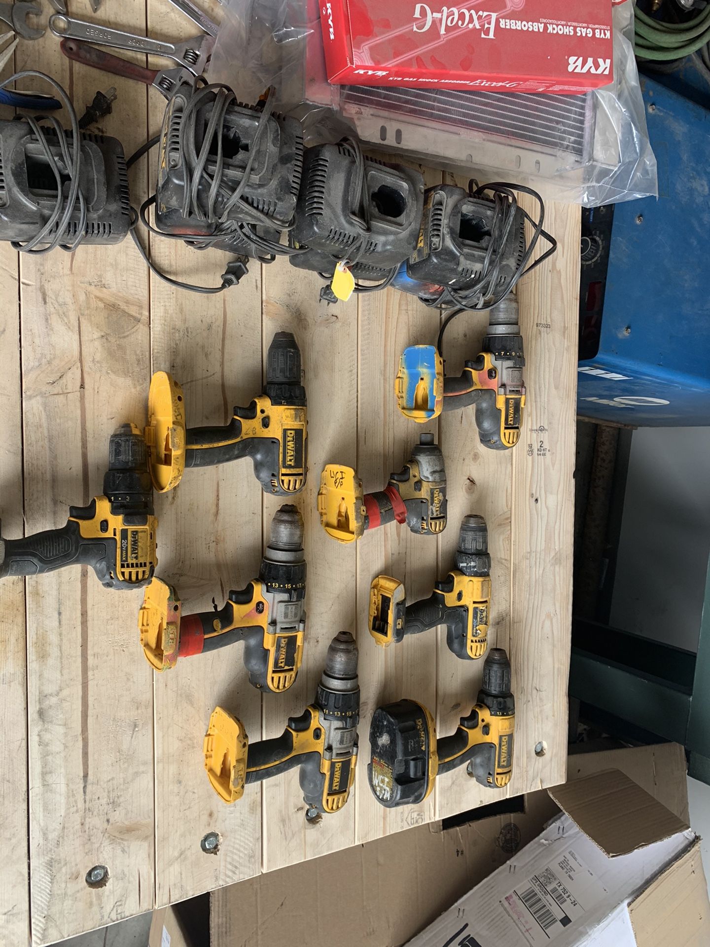 8 DEWALT DRILLS AND DRIVERS. 8 CHARGERS AND A BATTERY