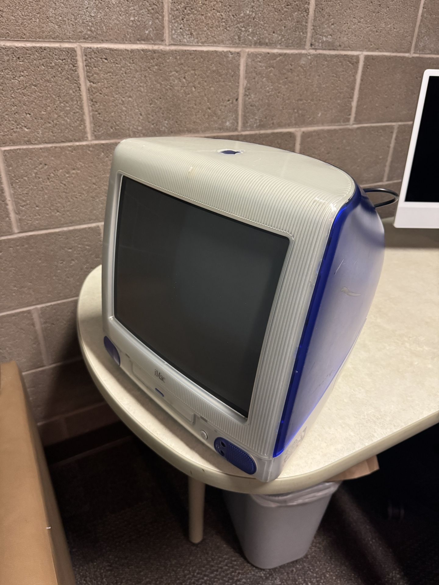Condition: vintage, used Category: retro desktop computer / collectible technology Color: translucent blue and white Era: late 1990s–early 2000s Still turns on/operational
