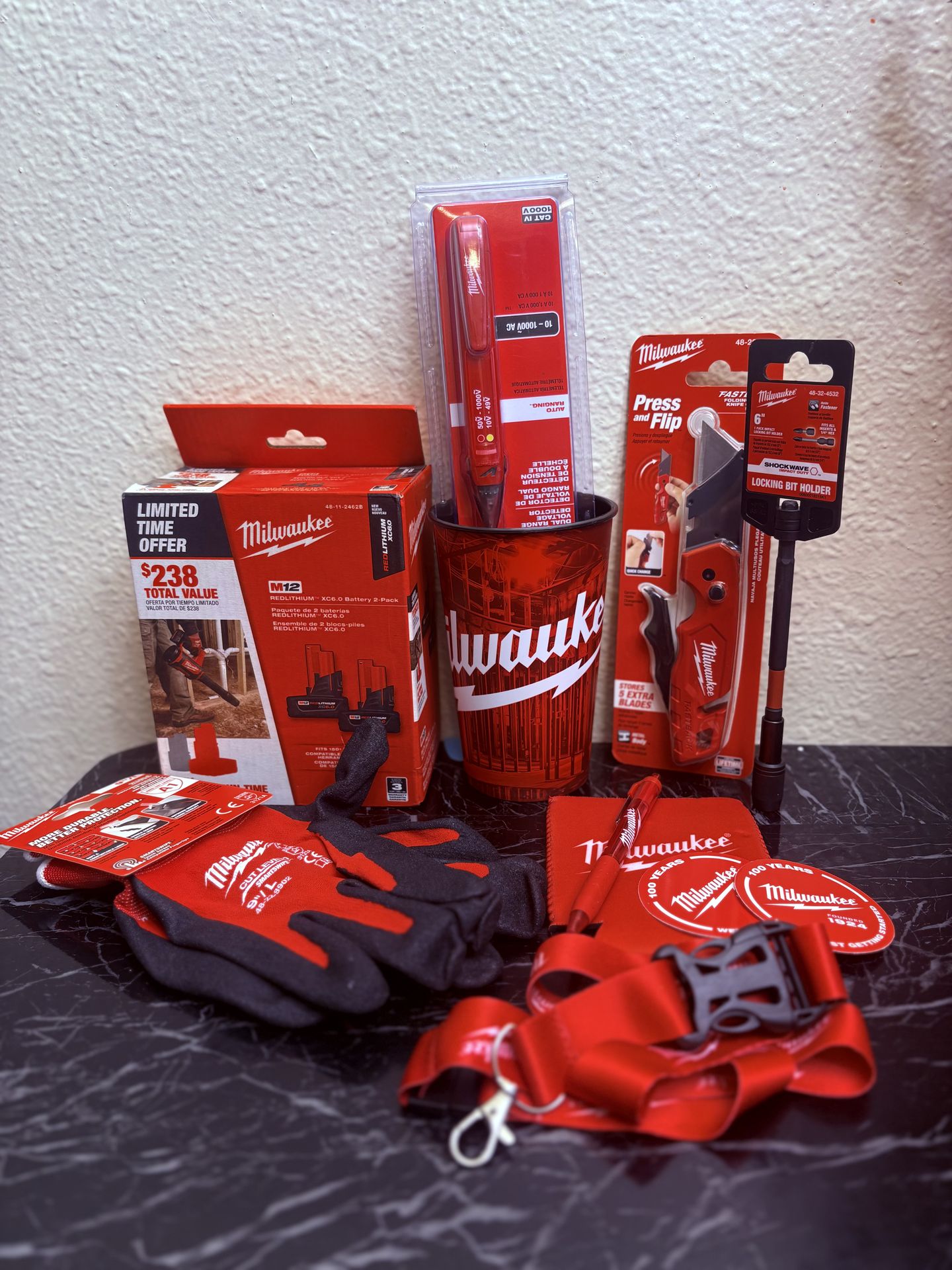 - Milwaukee REDLITHIUM XC6.0 Battery 2-pack - Milwaukee Dual Range Voltage Detector - Milwaukee Large gloves - Milwaukee fastback knife - Milwaukee cup with cover - Milwaukee key chain - Milwaukee pen and key chain