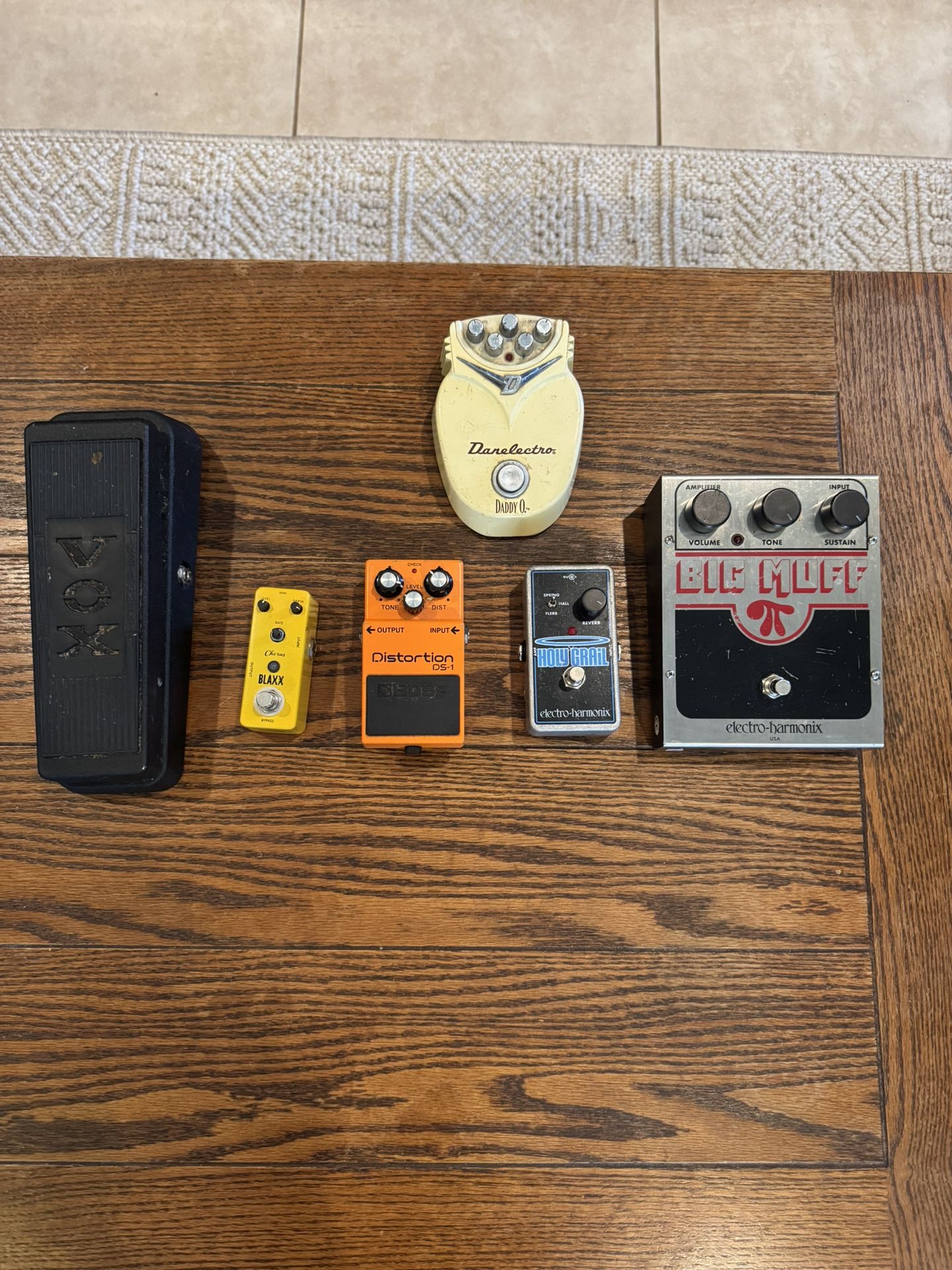 Electro-Harmonix Nano Big Muff Guitar Effects Pedal $65 Electro-Harmonix Holy Grail Reverb Guitar Pedal $65 Stagg BX-CHORUS Blaxx Chorus Effects Pedal - Yellow $40 Danelectro Daddy O overdrive guitar pedal $45 Vox V845 Classic Wah $45 $280 for everything.