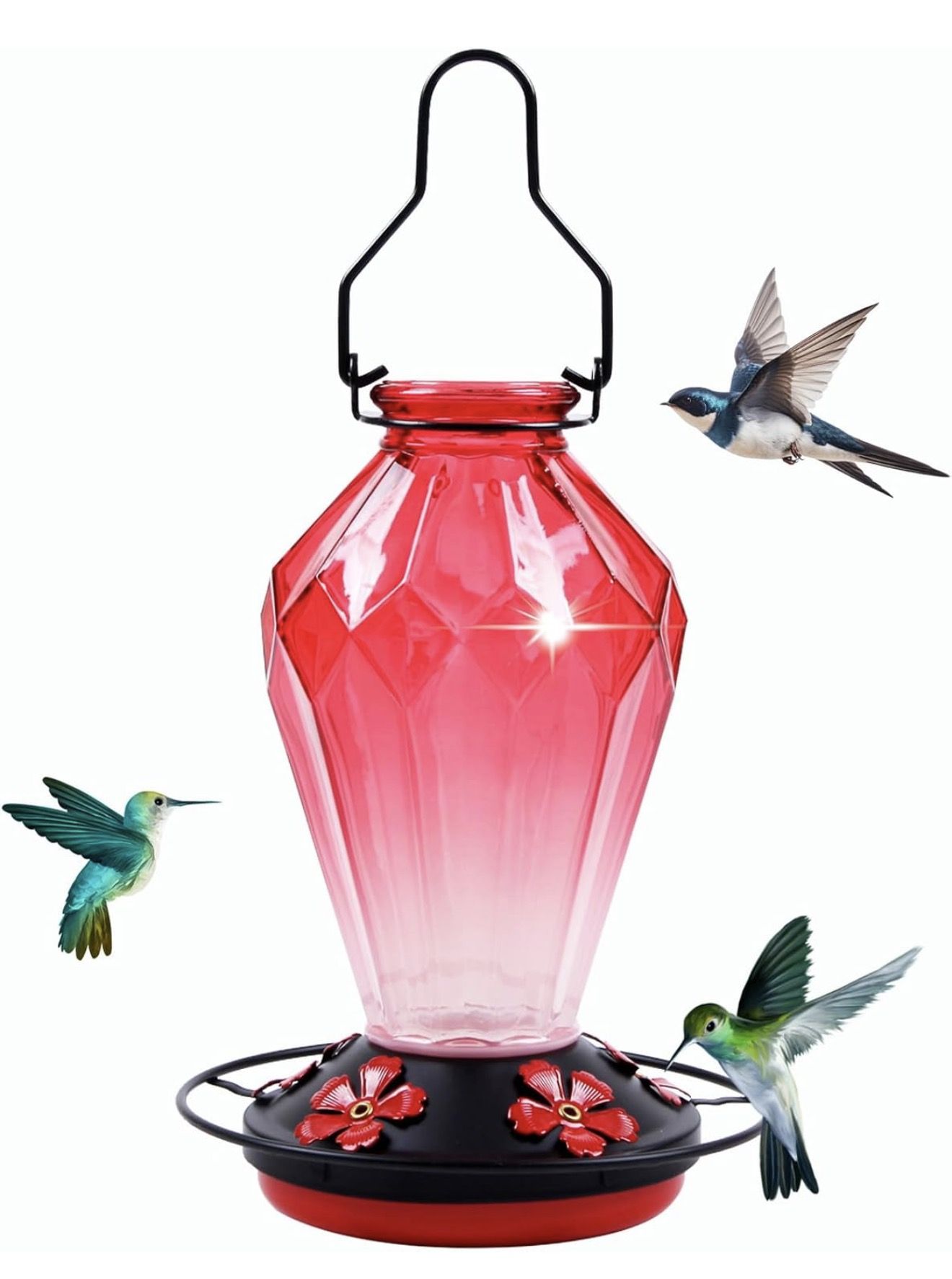 Hanging Outdoor Glass Hummingbird Feeder, 25oz Hummingbird Nectar Feeder, Hanger, 5 Flower-shaped Feeding Ports, Leakproof Base, Garden Hook