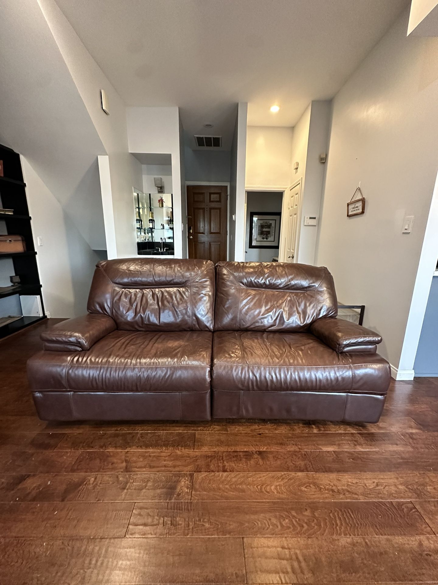 *VIRTUAL GARAGE SALE* Brown leather couch with electric lay flat recliner. Both seats fully recline at a push of a button. All cords and adapters included.