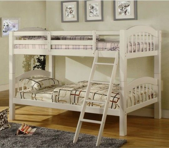 Twin-Over-Twin Convertible Bunk Bed with Stairs, Bunkie Boards, and Mattresses The CM-BK524W is a twin-over-twin bunk bed from the Coney Island collection by the manufacturer Furniture of America. It features a classic, transitional design with a white finish. Includes the following items, which were purchased separately: - 2 Bunkie Boards ($200 value) - 2 Mattresses ($200 value) Key Features - Size: Twin over twin. - Material: Constructed from solid wood and wood veneer for durability. - Style: Transitional design with a "picket fence" or slatted headboard and footboard design. - Safety: Includes full-length wooden paneled guardrails for safety and a fixed, front-access ladder. - Versatility: The bunk bed is convertible and can be separated into two individual twin-size beds. - Mattress Support: A slat system is included, meaning a box spring is not required. - Dimensions: Approximately 80 inches (L) x 42.62 inches (W) x 61.37 inches (H). - Options: An optional trundle or under-bed storage drawers may be available separately, depending on the retailer. Notes - all offers considered - ready for pickup - cash only Please contact me with any questions or comments. Thanks for your interest!