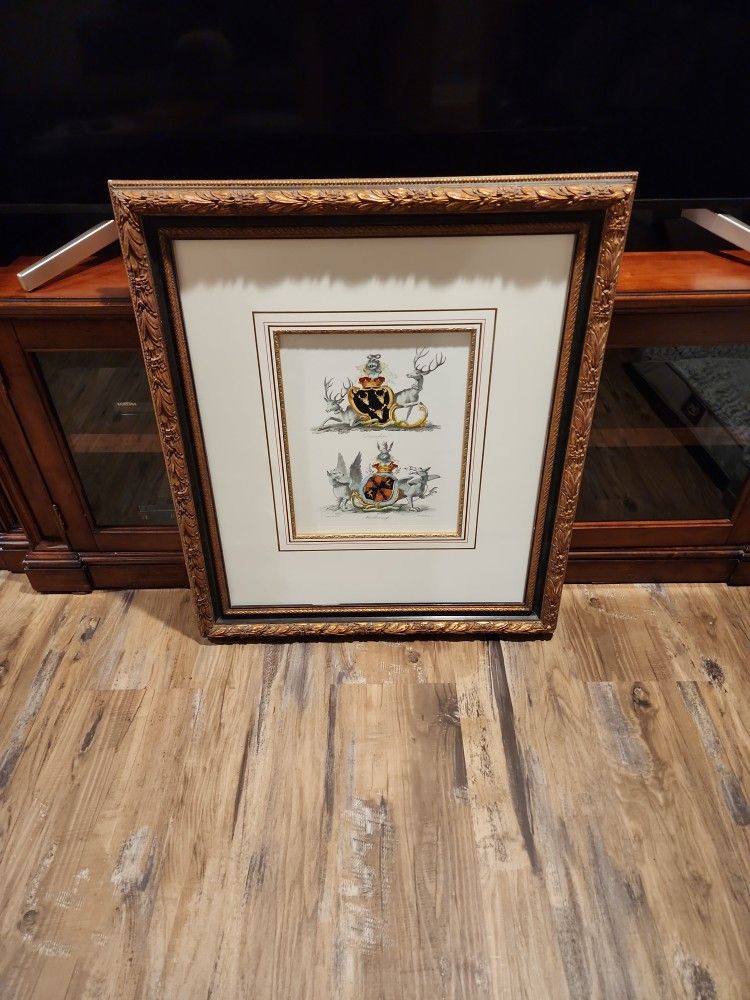 Pair of framed armorial etchings of English coats of arms. These prints are from a series called "English Peerage" and were originally drawn by Charles Catton and engraved by Francis Chesham in 1790. The top coat of arms is identified as "Devonshire". The bottom coat of arms is identified as "Marlborough". Measures 27 x 31 The glass broke so there is nothing protecting the picture. I dont want to pay to get it re framed. Free with $40 purchase. Check my other listing's and tell me what you like. Thanks