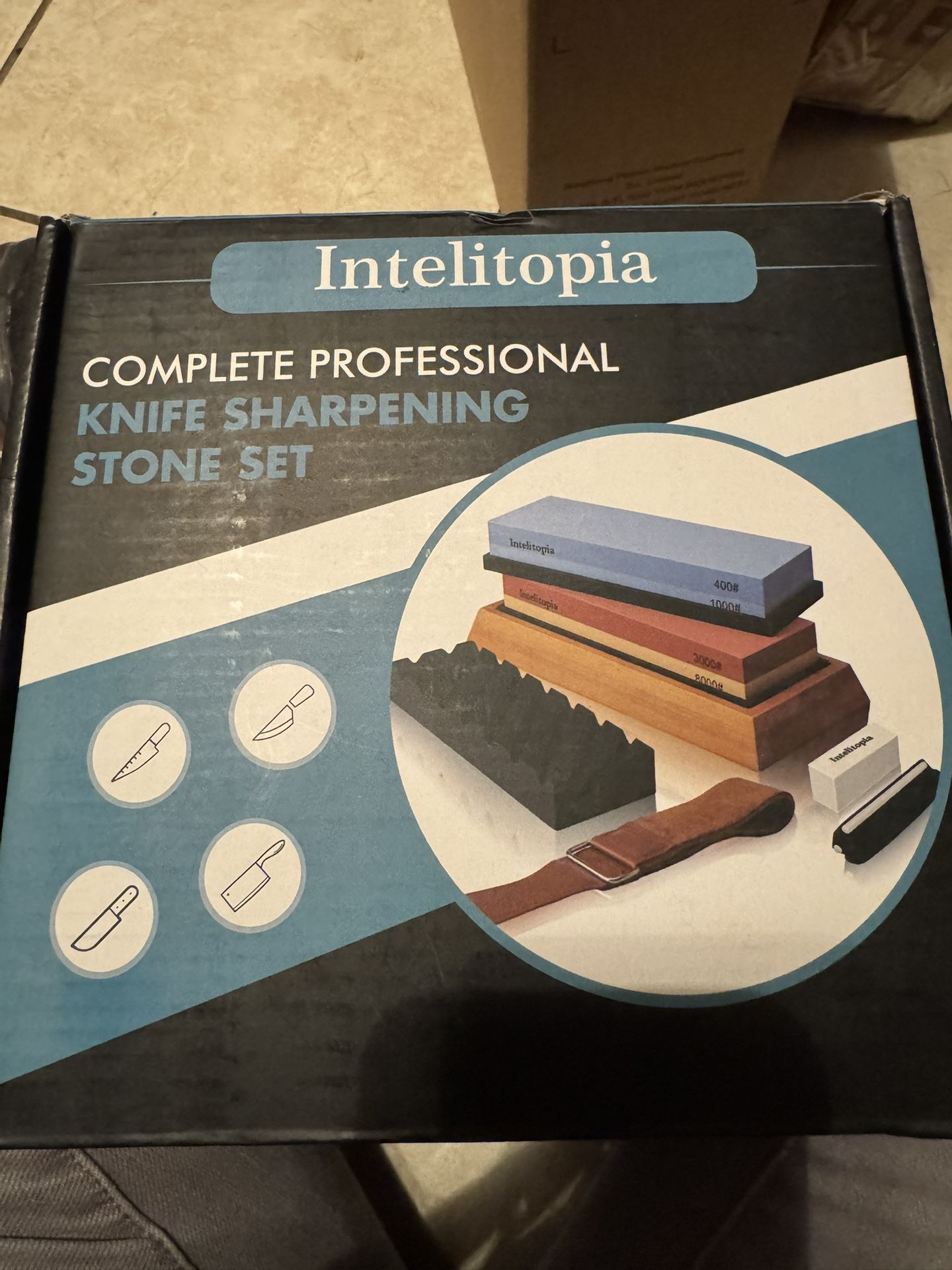 Dual Grit Whetstone 400/1000 3000/8000 Knife Sharpener with Leather Strop, Flattening Stone, Bamboo Base, 3 Non-slip Rubber Bases & Angle Guide Brand new, everything still in the plastic. This a great gift for someone entering the culinary or someone wanting to learn how to maintain their knives like a pro. Perfect for beginners and on up. Asking 25