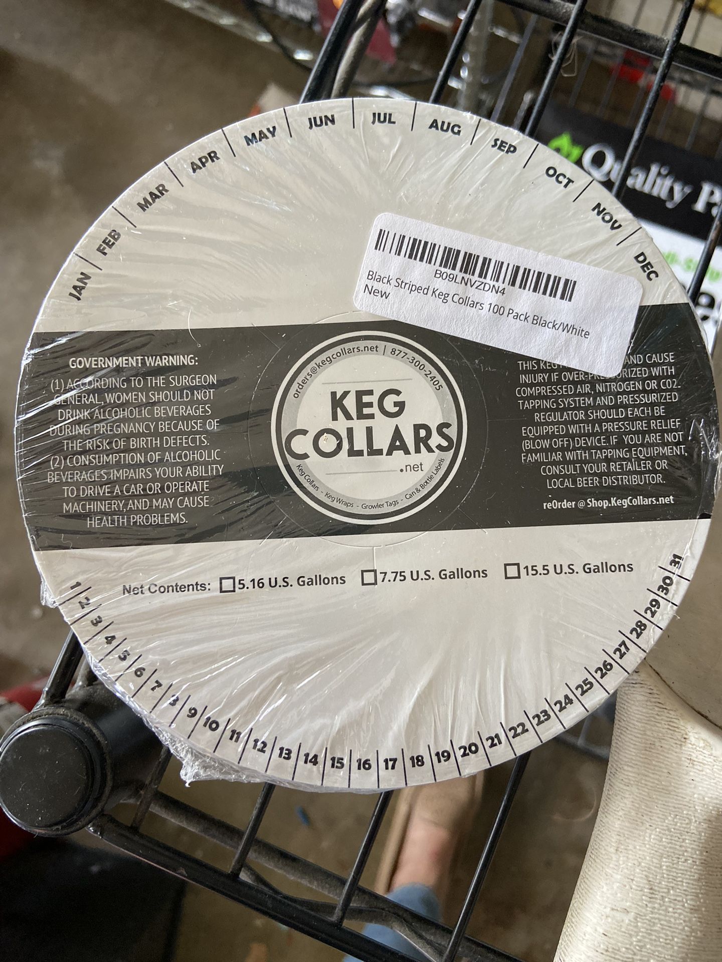 New in Package Keg Collars Pack of 100 Black striped NIB Lots of other things for sale from Restaurant Brewery Closing. Message if interested.