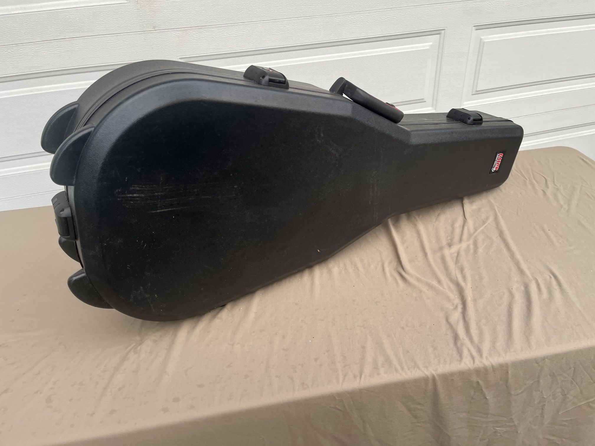 Gator Dreadnought TSA Case military-grade polyethylene plastic, TSA-approved locking latch. shielded by impact diversion housing. ergonomically molded handle. the guitar rests in a snug nest of thick EPS foam, enveloped in soft black plush. An extended reach neck cradle ensures the guitar remains securely positioned inside. $180 new. Moving internationally, can’t take it with. Cash or Venmo. Easy pickup. Located in Tukwila just off I-5 and 509.