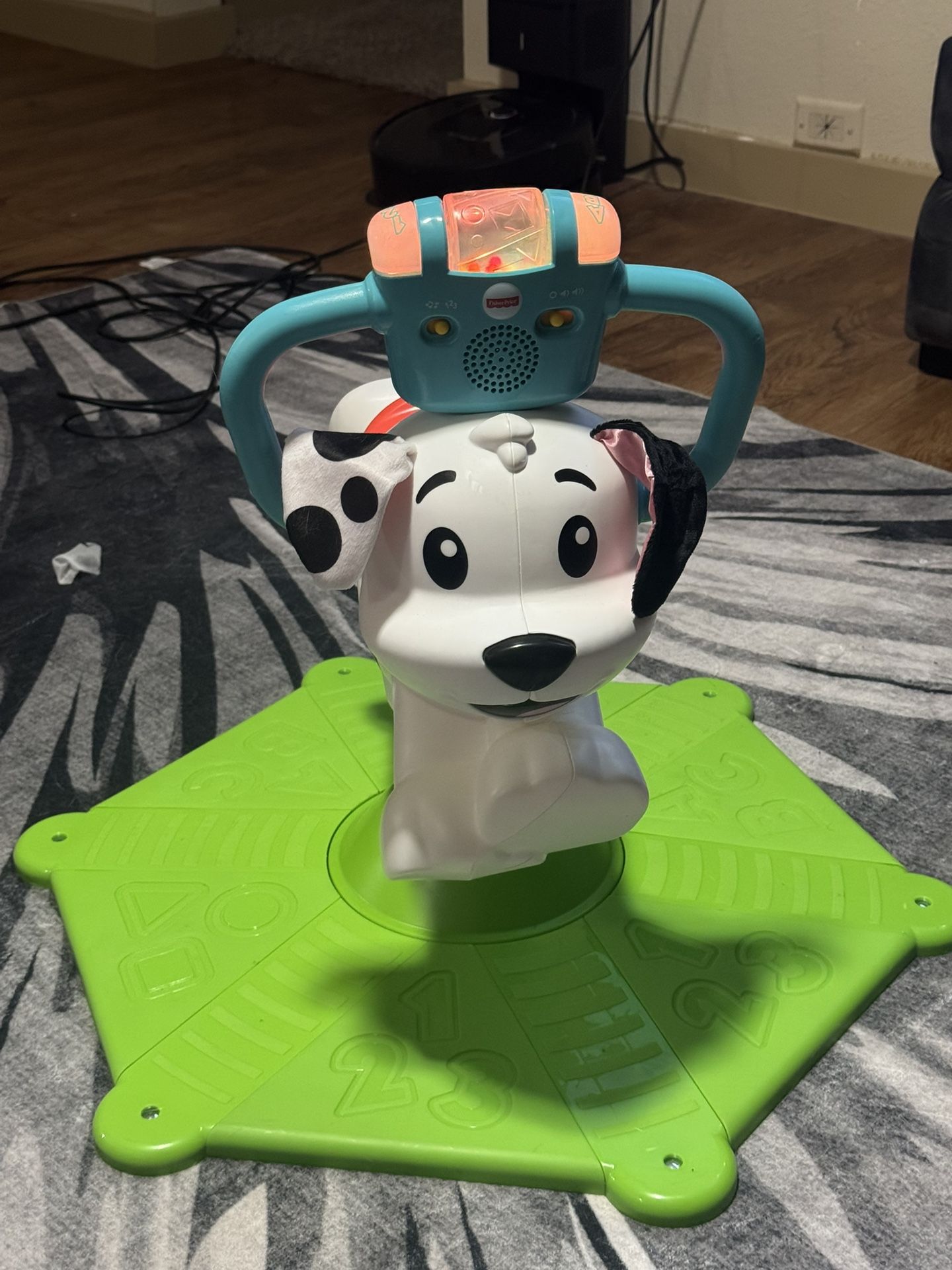 Toy for 12months + helps with motor skills to jump and turn while playing music with numbers . Lights up when you spin the rattle .
