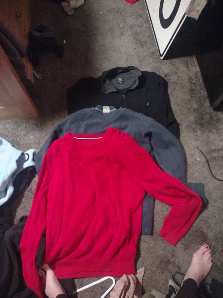 Polo fleece jacket size large, Columbia sweater size XL, and tommy Hilfiger sweater size XL.