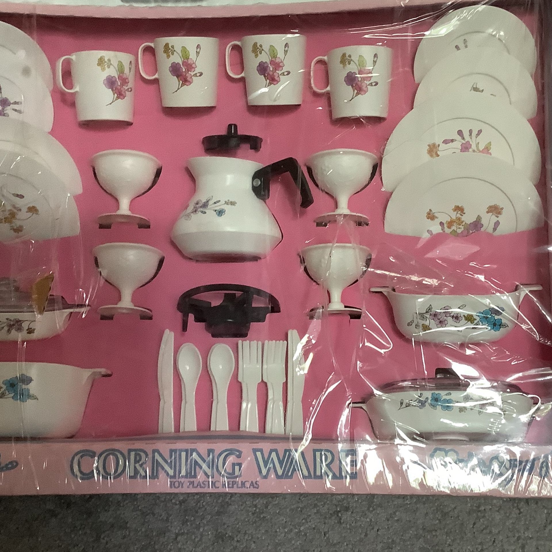 This is a service for four toy replica of a Corningware set. It has 35 pieces, four plates, four saucers, four cups four goblets, four knives, four spoons, four forks, a tea/ coffee pot and lid, a coffee pot stand, four striving pots and two lids (each lid fits two pots). The floral pattern is pink blue and lavender. This is new in the original packaging, never been played with. Plastic wrap shows wear. But the toys are perfect.