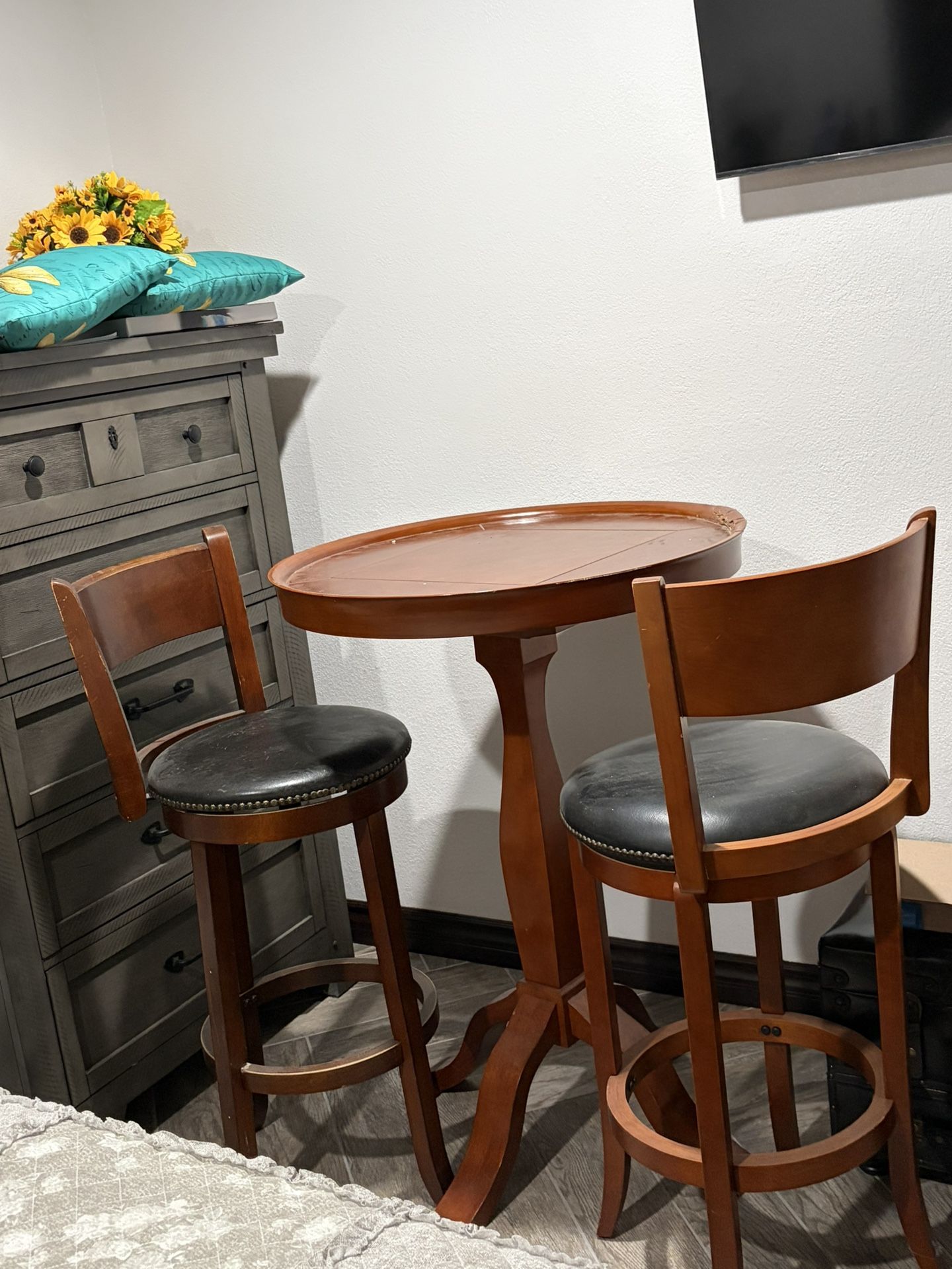 Nice game table or barstool table with three chairs. Chairs have leather seats.. table opens up with checkerboard everything good condition. Table has slight crack in corner. MUST SELL