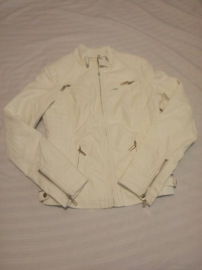Off White colored Jacket! Good Condition! Gold Buckles! Multipule Pockets with Zippers! SIZE:S