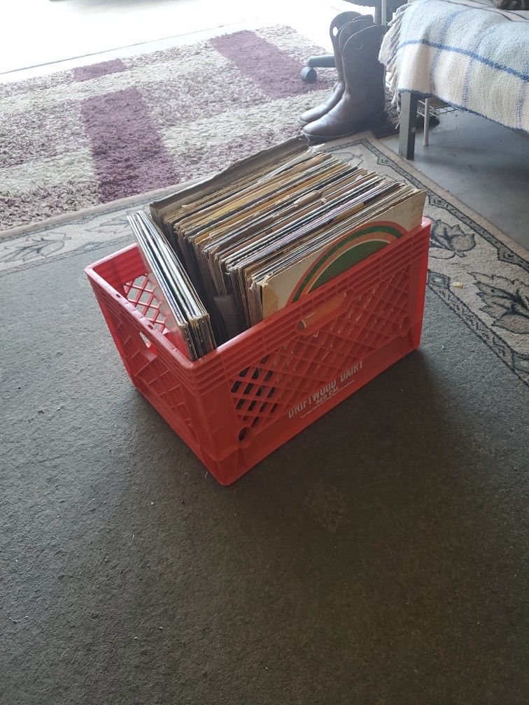 There's a bit of em there couple different types of music. There's a variety of conditions there mostly all playable couple here and there with no sleeves. Take them all. 60$ 70 with the crate.