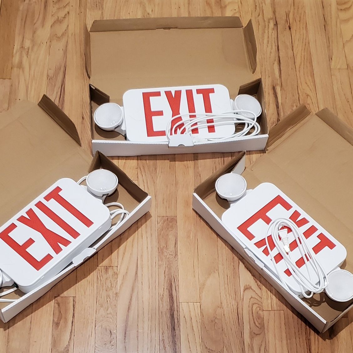 Selling 3 NEW IN ORIGINAL BOX authentic Fulham Firehorse emergency exit sign with red letters, power cord, 2 LED lights, push-to-test button, and battery back-up. Model # FHEC30WR. Each sign measures about 11.5" x 6.75" x 1.75" excluding lights. Features: - Thermoplastic Micro LED: Reliable lighting to make the emergency exit sign easy to read in light or dark - Red Lettering: Against a white background, this exit sign is highly visible - Damp Location Rated: Exit light can operate safely even in humid and damp environments, such as tunnels, basements, and other areas with limited ventilation - Energy-saving: Great for that environmentally conscious builder who wants to keep the electric bill down - Emergency lighting: Large lights will illuminate in the case of a power failure See pictures for more detail. Feel free to message me with any questions.