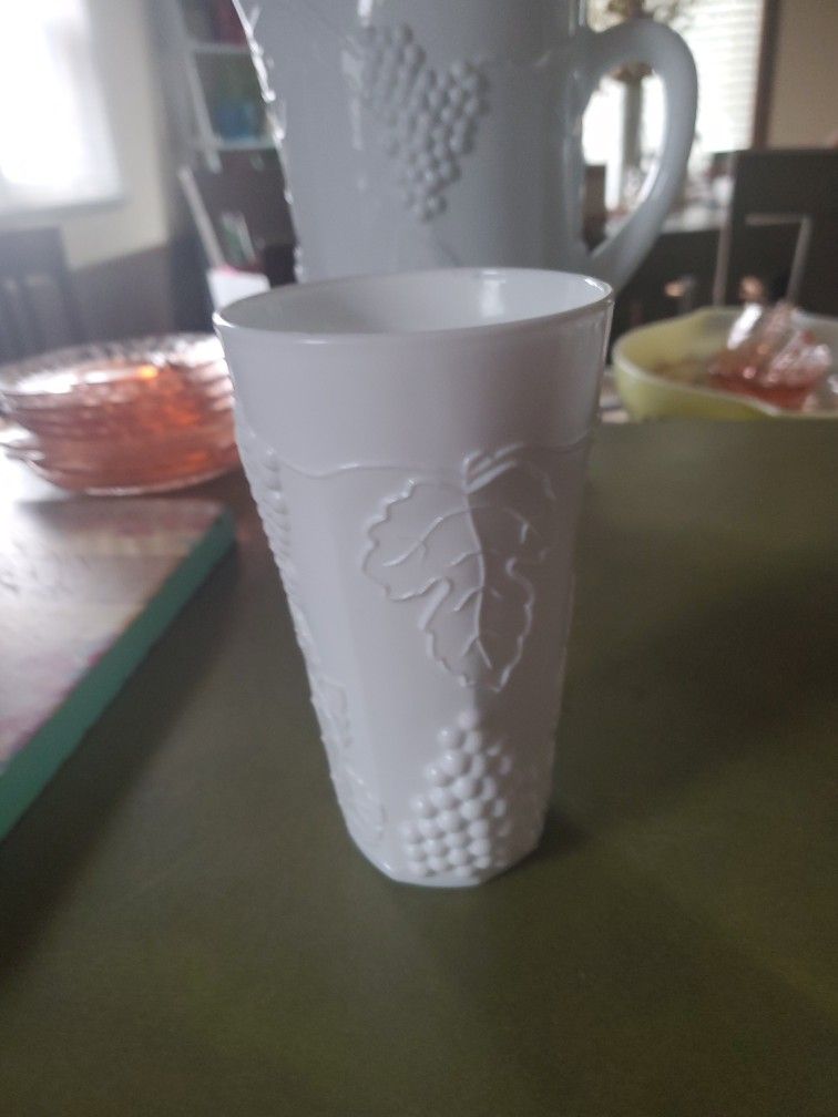 Vintage milk glass I pitcher 8 glasses and metal rack for glasses perfect shape