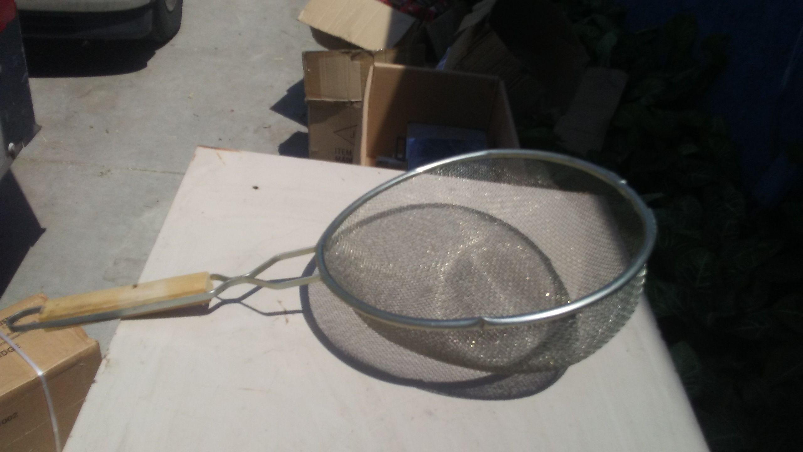 Big strainer. Double layer. About 10" inches in diameter or 25.5 cm and 20" inches long.