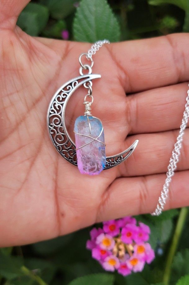 Blue and Pink Aura Quartz Crescent Moon Necklace. Crescent moon pendant measures 1 1/2 inches, handmade for women and girls ,pictured necklace is the one you will receive. 25% if you purchase through my Etsy shop. Crystal Vibes by Thelma Over 500 crystal items listed