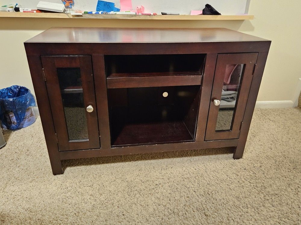 Dark wood TV stand with 2 glass panel doors. 42" wide, 27" tall, and 20" deep. Not perfect, but still a very solid and nice cabinet.