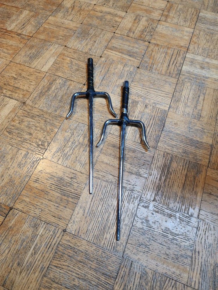 I am selling my son's practice Sai. These are heavy, solid, and not toys. If these hit you, they will cause injuries.