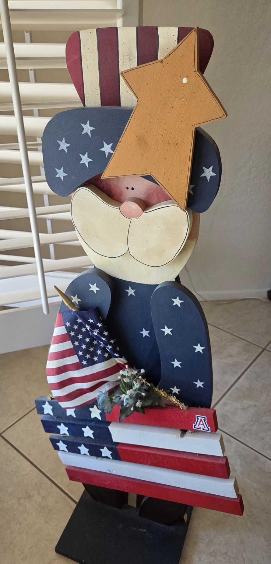 Beautiful wooden patriotic statue. Solid, handcrafted, sturdy handpainted wood. All high quality. GREAT year round & for holidays. 44" tall x 17" wide, about 16 #. CASH & local pickup only please.8