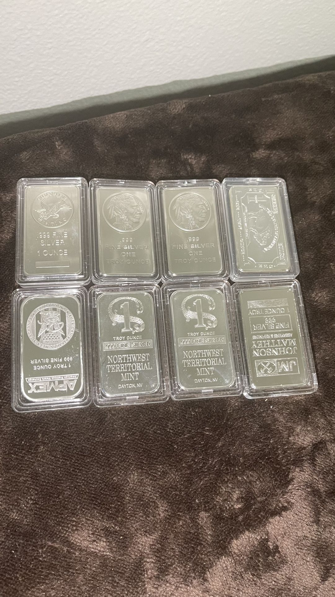 1ounce silver bullion 999 31.1 gram 2.25x 0.75x1/8” ( 51x/9x3 millimeter )set of 8 0.54 ounce 248 gram plated with rhodium to prevent tarnish of the bullion you can google it and find out about rhodium acid test wouldn’t we pork on rhodium 560 each set 8x70=560$(?1120$for all Serious call only please I had enough of this item available