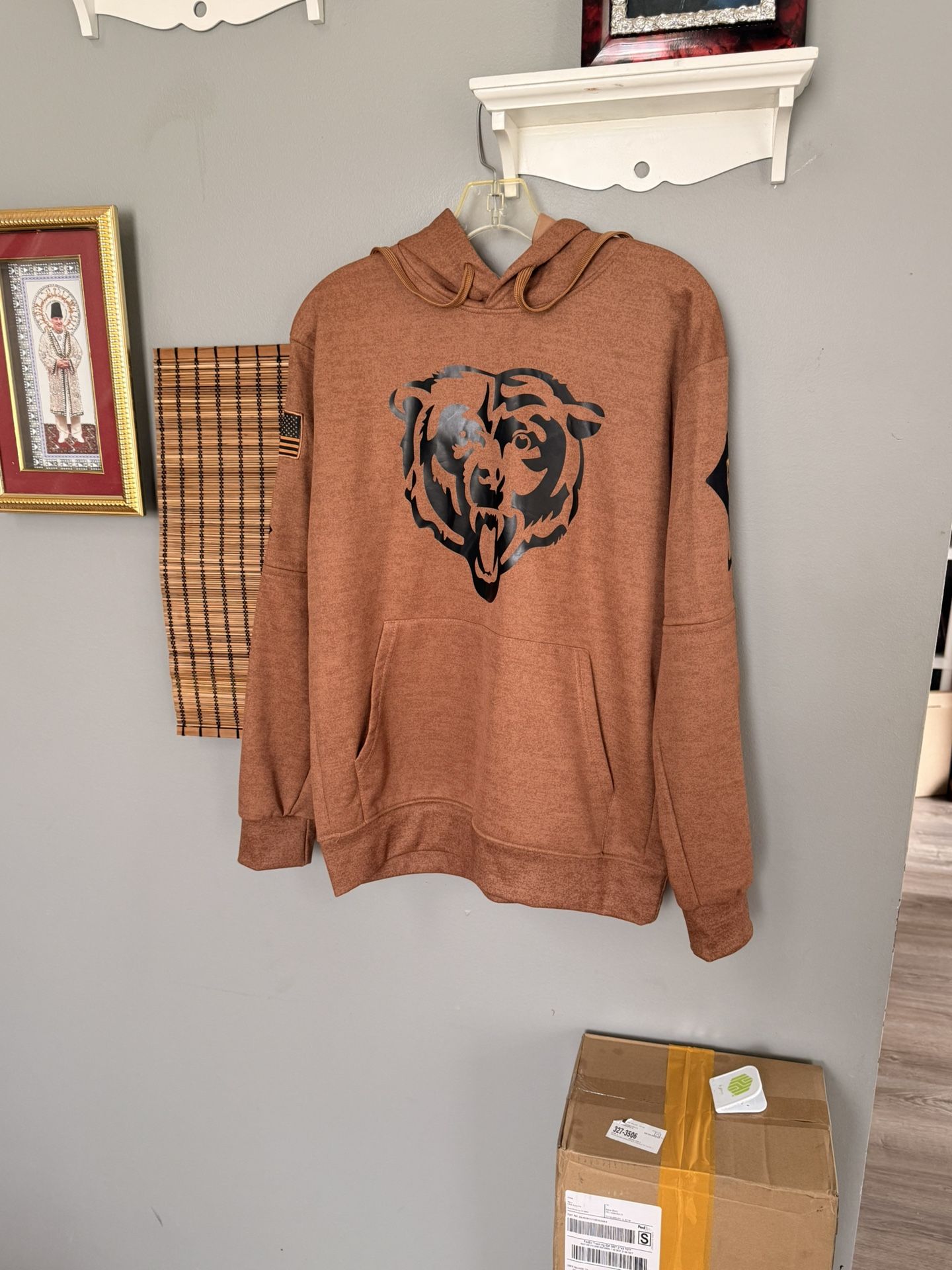 A never worn genuine NFL MERCHANDISE MADE BY NIKE CHICAGO BEARS HOODED SWEATSHIRT WITH THE LOGOS OF THE NFL NIKE THE AMERICAN FLAG AND THE CHICAGO BEARS ON EACH SLEEVE in an unique light golden brown color and the material also so unique and so lightweight that it feels like suede. It costs $70 plus tax and shipping online but I’m only selling it at a loss since I can’t return it as it was received as a gift though I love it as it looks so gorgeous but my loss is your gain. Don’t wait on buying this one for yourself or as a gift as it is a unisex style as it will sell fast. This comes from a smoke and pet free home. Local pickup is by Schaumburg and Barrington Road in Schaumburg IL 60194 or shipping is available to your doorstep with free tracking included.