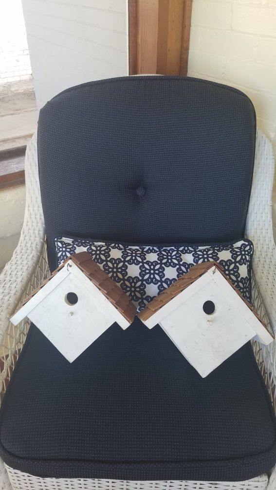 Two new wooden birdhouses new. They open from underneath. Dimensions approximate 8" by 8" by 7"