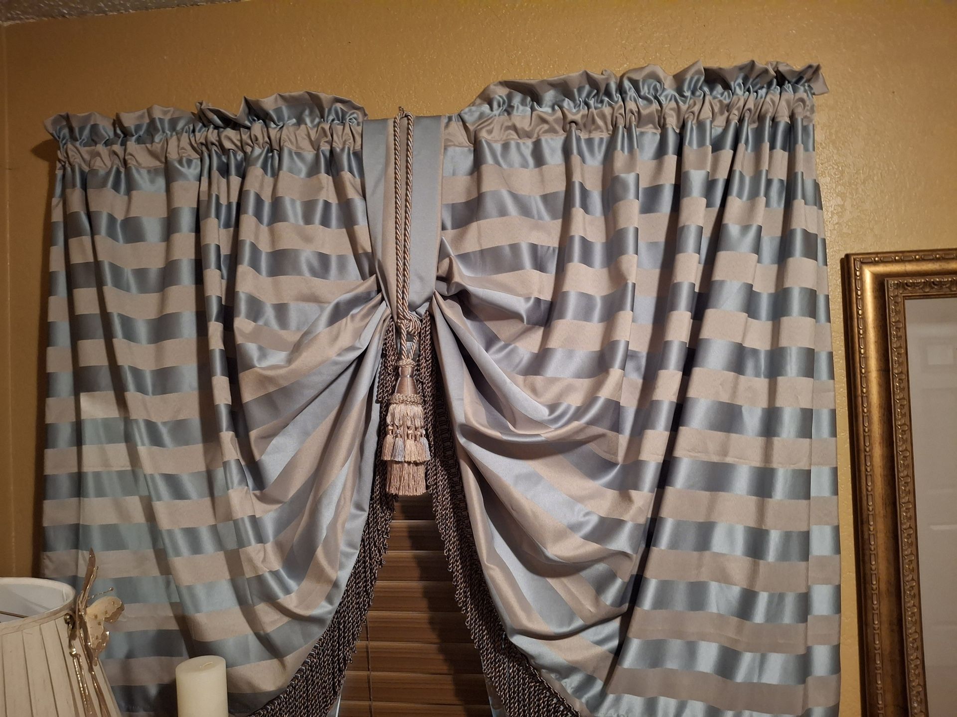Queen size custom headboard, comforter set with matching pillows, custom curtains, 2 mirrors, 4 pictures, candle holders