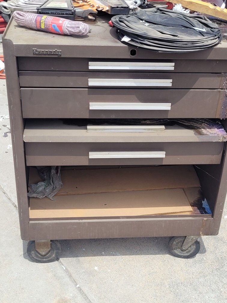 Kennedy tool box machinist toolbox. Drawers work well there's nothing wrong with this box other than the paint came off because laundry soap got spilled on it for a period of time. I have brand new cylinder locks for it's never been out of the package, I'm hoping by lowering the price someone will not take advantage of me.