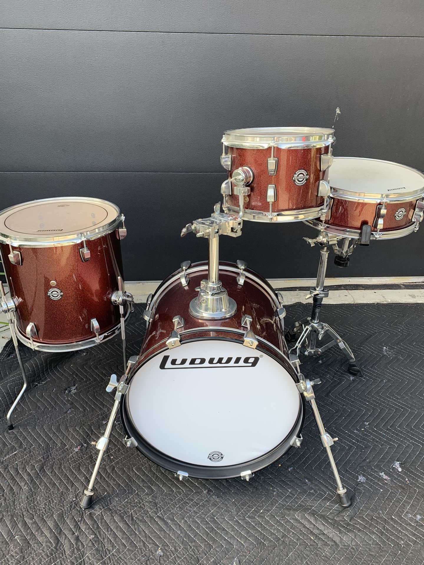 Overview: Heads: Stock Remo Pinstripes Condition: Excellent Color: Red Sparkle Shells: Poplar Configuration: Bop / Pocket Bass Drum: 16” Floor Tom 13” Toms: 10” Snare: 14” Tom Mount NO OTHER HARDWARE OR CYMBALS INCLUDED