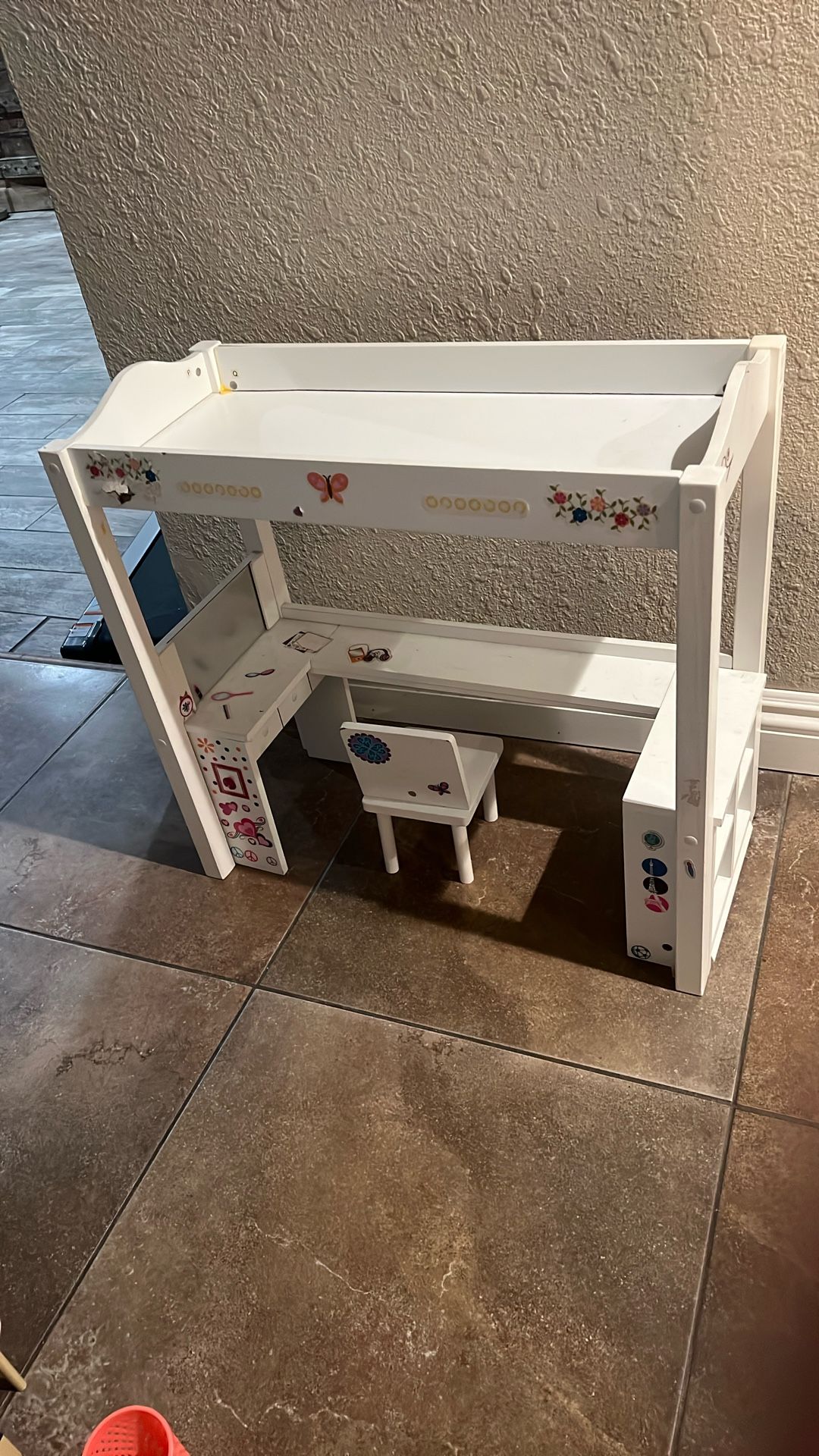 Used doll bed and desk with chair for 18” American girl or Our Generation, etc. Could use some tightening of screws.