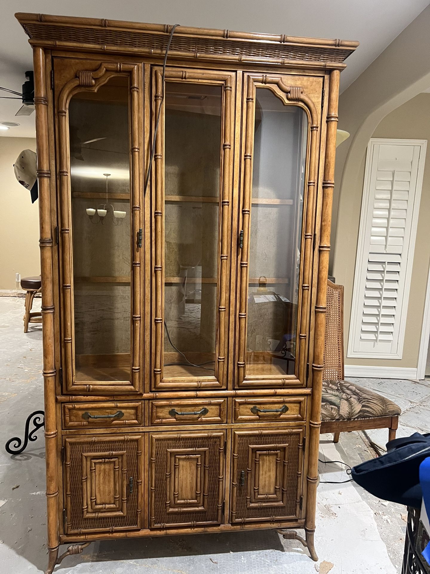 This piece is a large vintage display cabinet / china cabinet in a tropical coastal style, most commonly associated with bamboo or rattan-inspired furniture from the 1970s–1990s.