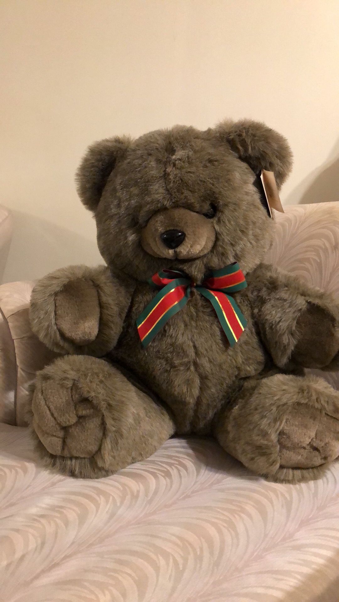 Sable/Grey teddy bear. Extremely soft and plush with red and green ribbon around the neck. 20” tall 17” wide