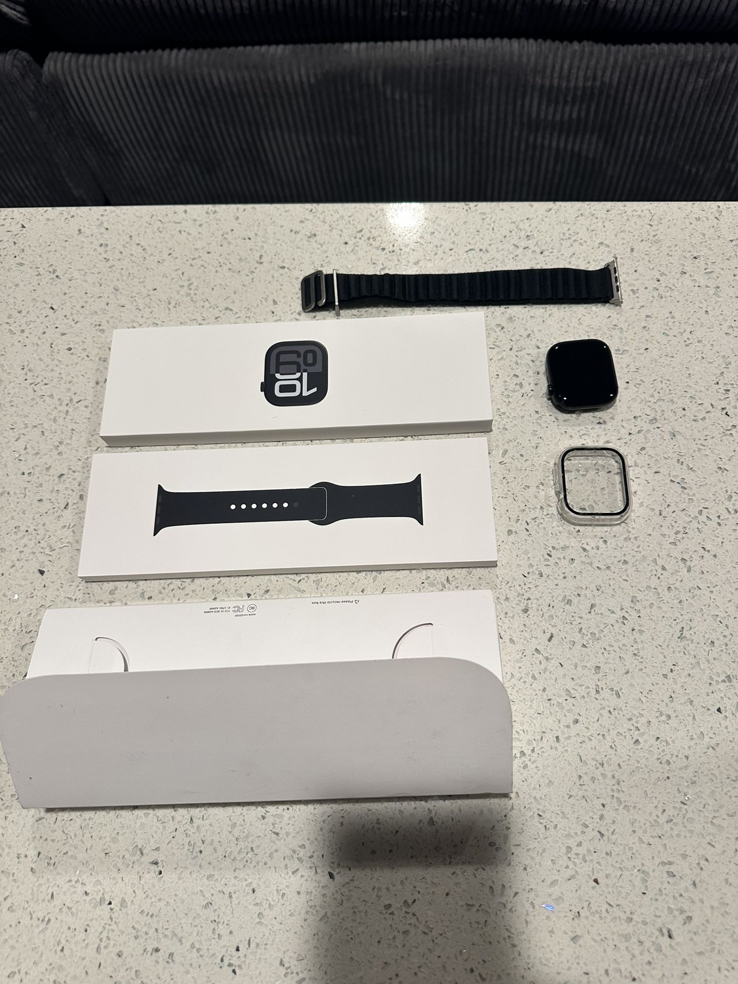 Apple Watch Series 10 - 46mm (Aluminum Case, Ion-X Glass) ✅ Good condition – 9/10 aesthetics ✅ Fully functional ✅ Comes with original box and charger Lightly used and well taken care of. No cracks or major scratches. Great for fitness tracking, calls, and notifications.