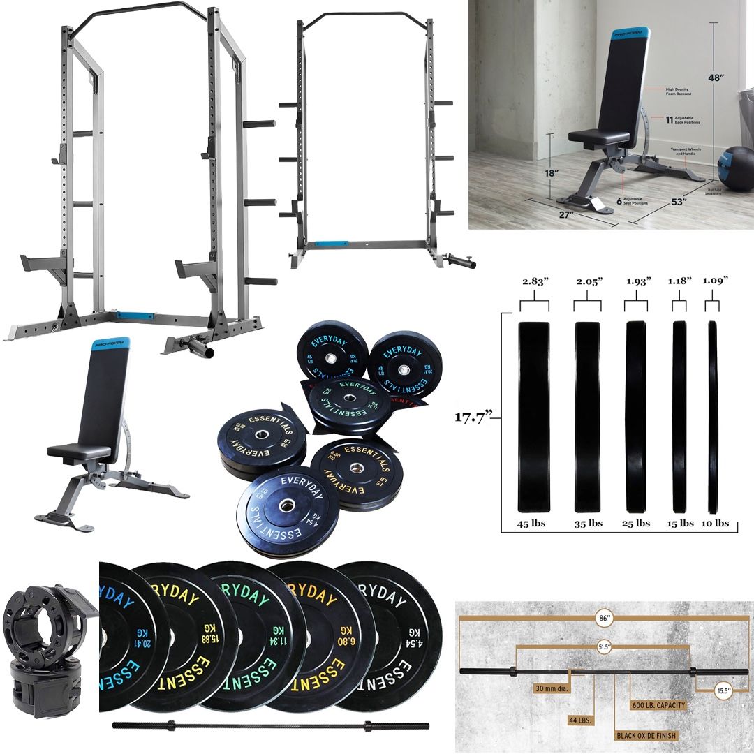 Just pulled pictures from the sites I got them from. It’s all in good condition just a little dusty. Willing to sell each item individually or as a complete package. Paid $1330 for everything. Weight Bench: ProForm Adjustable Olympic Freestanding Weight bench Paid $198 Selling for $99 Weight Rack: ProForm 166.45-lb Weight Storage Paid $440 Selling for $220 Bumper Weight Plate Set: 10lbs x2 15lbs x2 25lbs x2 35lbs x2 45lbs x2 Paid $530 Selling for $265 Barbell Clamps: Paid $17 Selling for $8 Olympic Bar: 7-Foot Paid $145 Selling for $73