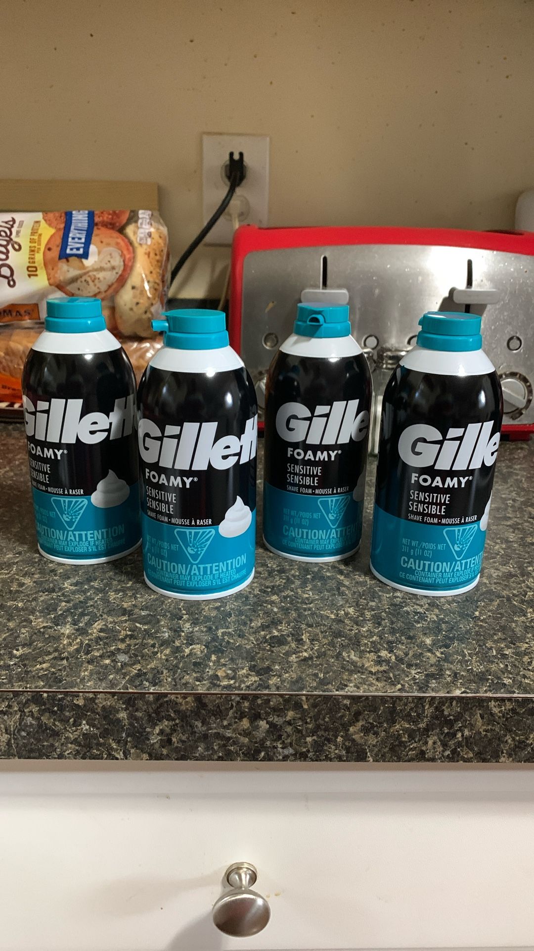 Four new cans of Gillette “Sensitive “ Shave Cream. These would cost you $9.88 plus tax if purchased at Walmart.