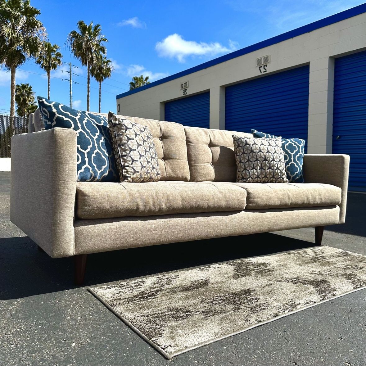 Selling My Beige Mid Century Modern Tufted Sofa. Comfortable Back and Seat Cushions, Smooth Fabric, Tufted Seat and Back, Clean. Excellent Shape. Original Condition. Made by Greathouse Furniture. Dimensions: 87in Long, 36in Wide, 18in Seat Height, 34in Tall Backrest. Pickup in 92109 or Delivery with Zipcode.