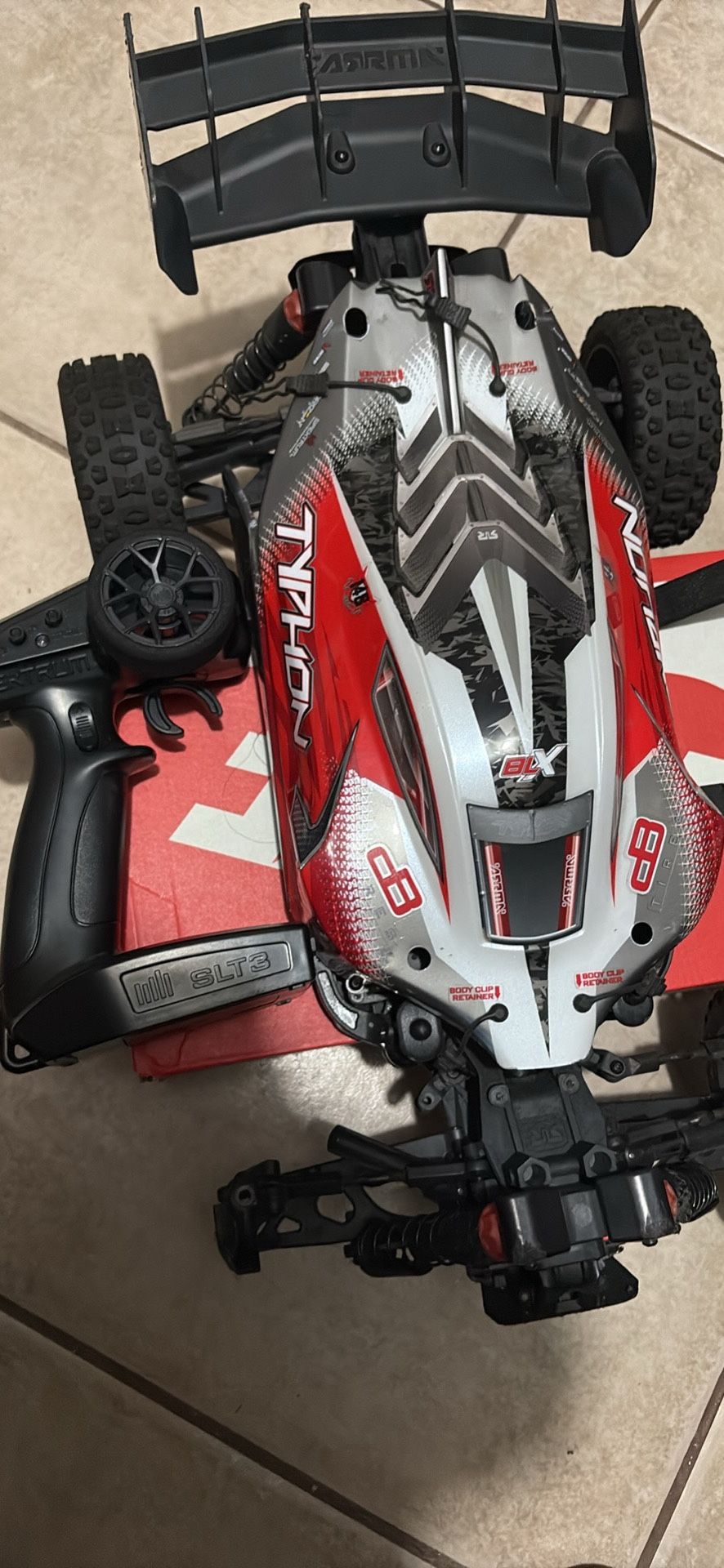 Selling my Arrma Typhon 3S BLX. This is a high-performance 4x4 buggy capable of 50+ MPH. The electronics and drivetrain are in perfect working condition. • Condition: All electronics (ESC, Motor, Servo) work 100%. • The Fix: Needs a new front lower suspension arm (It is a very easy repair or take it to the rc store. The wheel and hex are undamaged. • Includes: RC Buggy, Body, and Spektrum Remote Controller.