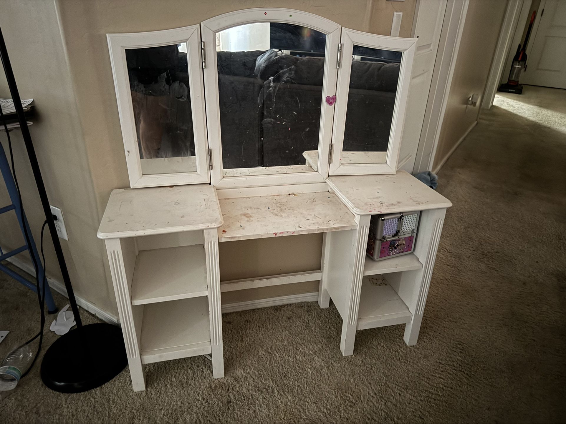 kids vanity definitely used and could used a good cleaning or painting to restore comes with little stool