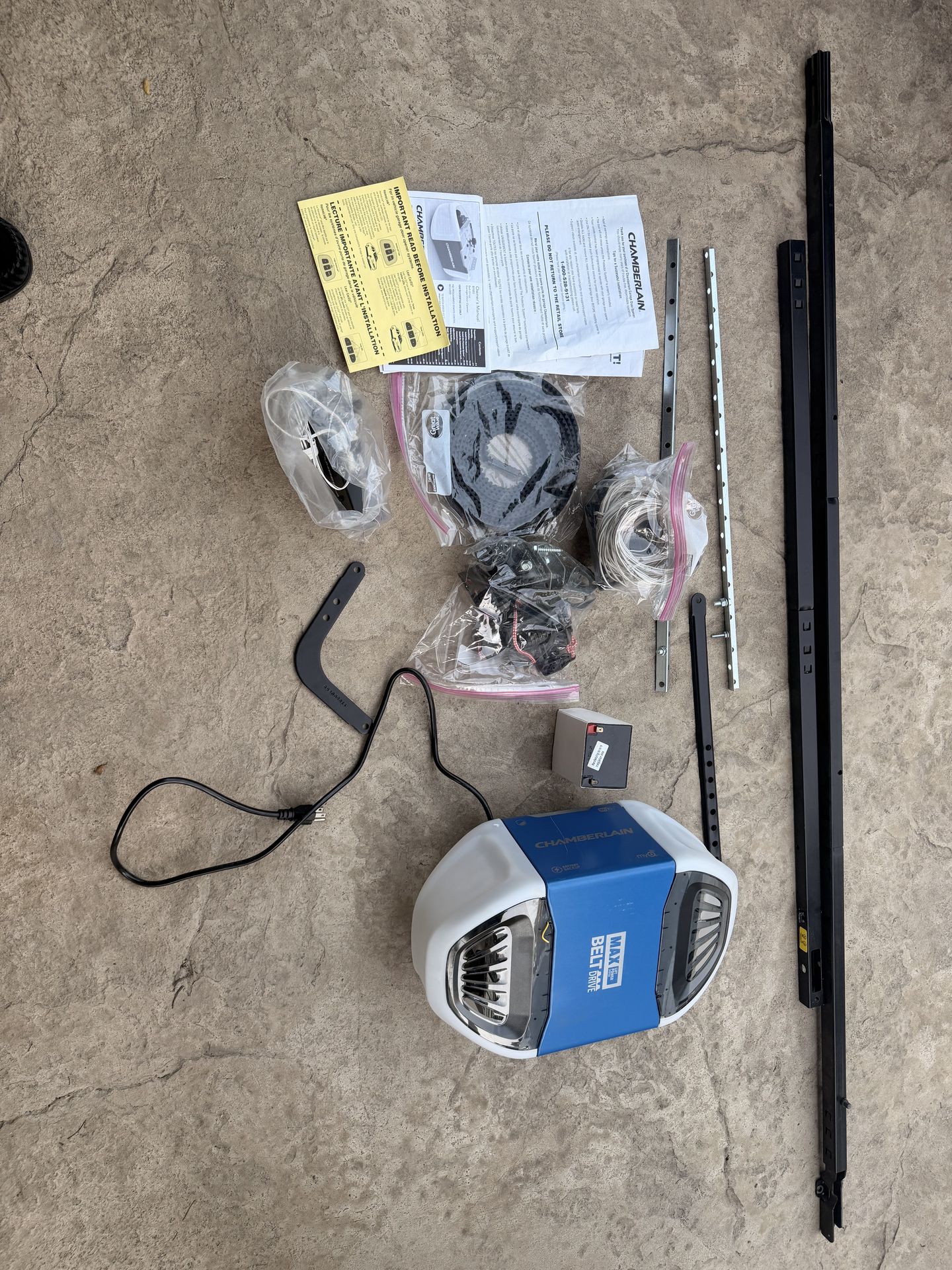 Brand new, Open box item. My garage did not have the clearance necessary to install it. All items included manuals are in the box!!